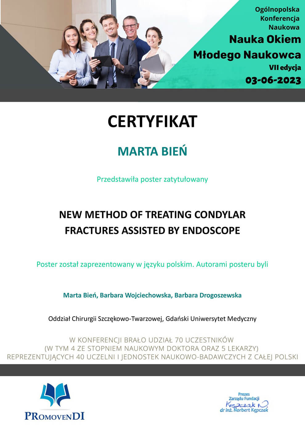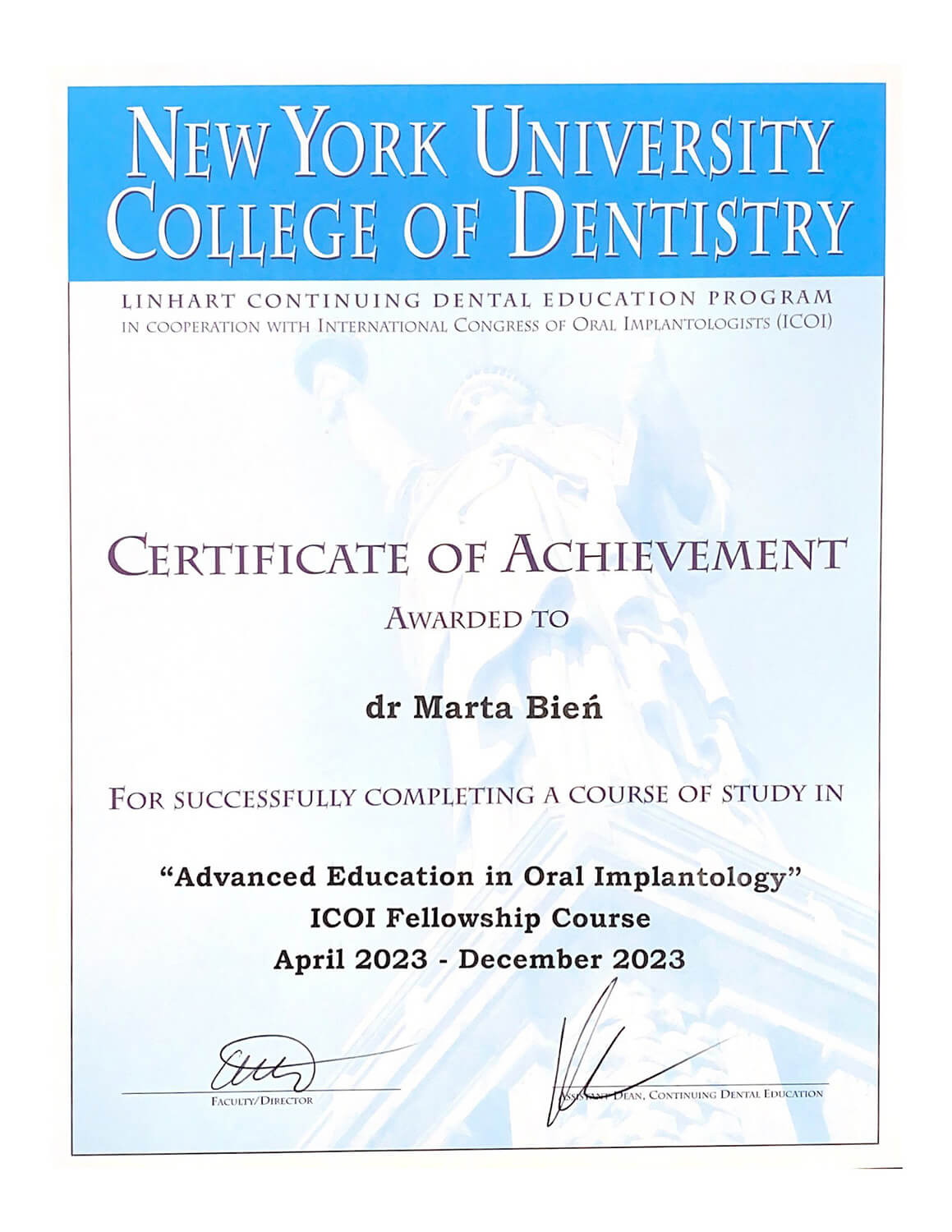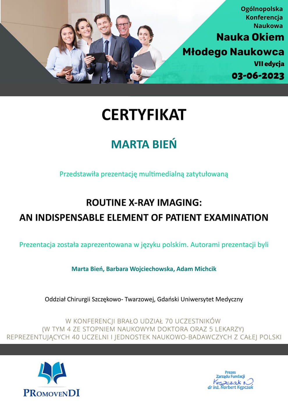 Ukończyła wydział Lekarsko-Dentystyczny na Uniwersytecie Medycznym w Gdańsku, gdzie obecnie się doktoryzuje. Rezydentka na Klinice Otolaryngologii z Oddziałem Chirurgii Szczękowo- Twarzowej Uniwersyteckiego Centrum Klinicznego w Gdańsku, gdzie specjalizuje się w dziedzinie Chirurgii Stomatologicznej. Członek Polskiego Towarzystwa Chirurgii Czaszkowo-Szczękowo-Twarzowej oraz Polskiego Stowarzyszenia Implantologicznego (PSI). Uczestniczka Implant Masters Poland (IMP), wychowanka The Dawson Academy Polska. Stale poszerza swoją wiedzę biorąc czynny udział w licznych międzynarodowych i krajowych kursach, szkoleniach i konferencjach.